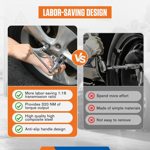 ✅ Effortless Lug Nut Removal: Removing rusted or tight lug nuts is a common pain point for car owners and mechanics. Our torque multiplier reduces the effort required by using a 1:16 gear ratio, giving you the power to loosen nuts that standard wrenches can’t touch.
