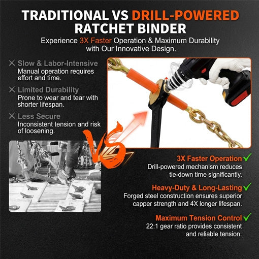 ✅Quick & Effortless Cargo Securing: Traditional ratchet binders are slow, back-breaking, and leave hands blistered. This drill-powered binder secures heavy loads in seconds, saving energy and time with minimal effort. Perfect for professionals on tight schedules.