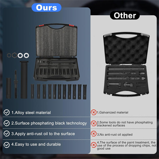 A:This In-Line Dowel Pin Puller Master Set stands out because it allows safe, controlled extraction without the need for sliding hammers, reducing hand strain and the risk of damaging surrounding components. Its master set includes both SAE and metric collets, making it versatile for a wide range of pin sizes. Built from durable alloy steel with black phosphating and anti-rust coating, it combines strength, precision, and ease of use, features many competing brands lack.