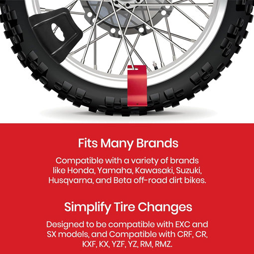 A: The Motorcycle Tire Bead Installation Holder Hook Set is specifically designed for dirt bikes and small-to-medium motorcycles with spoke rims, working best with brands like Honda (CRF, CR), Yamaha (YZF, YZ), Kawasaki (KXF, KX), Suzuki (RM, RMZ), Husqvarna (EXC), and Beta. It fits 15" to 21" spoke rims and is ideal for off-road and dirt bike tires, making tire changes faster, safer, and easier.