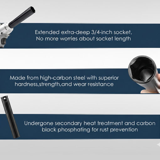 A: Unlike standard sockets, this tool is made from high-carbon steel with heat treatment for superior strength and durability. Its plastic-coated surface protects against rust and corrosion, extending the tool’s lifespan. The extra-deep design ensures secure engagement with bolts, making removal faster, safer, and more reliable in every maintenance task.