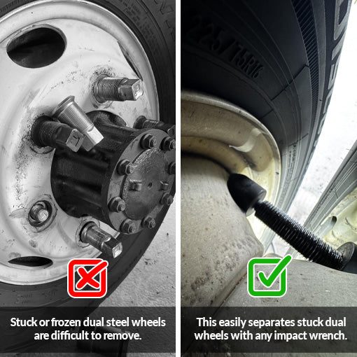 ✅ Easily Separates Frozen Dual Wheels: Stuck or frozen dual wheels waste time and often require dangerous hammering or prying. This kit solves the problem with a heavy-duty 1-1/8 inch diameter x 11 thread forcing screw and a ball bearing-driven one-piece pusher that connects to any air or electric impact wrench, applying smooth and even force to safely release wheels in minutes.